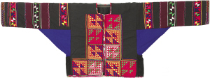 許多少數(shù)民族織繡作品都存在這種現(xiàn)象:刺繡紋樣沒有繡滿,蠟染紋樣沒有畫完。比如,其中一塊貴州花溪苗族十字挑花繡片,它的上方露著一塊沒有任何紋樣的黑底,用來給八角花紋樣勾邊的紅、綠色線條,似乎也沒有縫完。這樣的“半成品”,是因為“年久失修”脫落了,還是“做到一半沒線了”,亦或是“不拘小節(jié)”的風(fēng)格表現(xiàn)?
