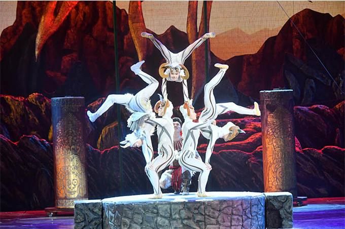 主創(chuàng)團(tuán)隊(duì)選取“賀蘭山巖畫”“巖羊”等寧夏獨(dú)有的文化元素符號(hào),以賀蘭山巖畫標(biāo)志性的“太陽(yáng)神”作為人物原型,以三個(gè)部落之間的結(jié)盟和沖突作為戲劇主線,準(zhǔn)確地將巖畫藝術(shù)與雜技藝術(shù)巧妙融合,使其成為既有濃郁地域文化特色,又有巨大時(shí)空張力,更有人類共同情懷的雜技劇。