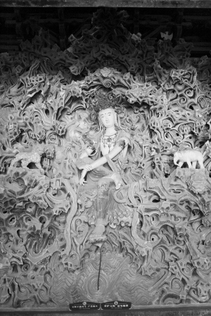 摩尼殿內(nèi)槽北壁是一座泥塑五彩懸山,上有塑像數(shù)十尊,正中為五彩觀音菩薩像,俗稱“倒坐觀音”。倒坐是指觀音菩薩不坐在大殿的正中央,而在后壁倒坐。觀音像衣袂飄飄、彩妝絢麗,面容秀麗恬靜,是古代彩塑中不可多得的藝術(shù)珍品。整個(gè)大殿的平面呈十字形,有16個(gè)凸轉(zhuǎn)角和8個(gè)凹轉(zhuǎn)角,形制特別。梁思成曾贊譽(yù):“這種的布局,我們平時(shí)除去北平故宮紫禁城角樓外,只有在宋畫里見過(guò),那種畫意的瀟灑,古今的莊嚴(yán),的確令人起一種不可言喻的感覺?!?/p>