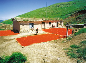 土房的室內除有的搭火炕外,其它的裝飾和木房的一樣。到了采收紅花的季節(jié),鮮紅欲滴的紅花曬滿了院子,形成獨特的風景。不論哪個房間,都可作為臥室,也用于待客,廚房和儲藏室單建,有的還單建馕坑。