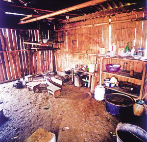 房內(nèi)一般隔成里外兩間,里間狹小,光線暗,是主人的臥室,只放雙人床和一小部分生活用品。外間寬大,是生火煮飯、聚會待客和子女就寢的地方?;鹛猎O(shè)在里間屋的門外,放鐵制三腳架,三腳架對應(yīng)的方位有固定的用途,即靠里間房門一方為主人的座位,靠外間房門一方為客人的座位,火塘上方靠墻處為子女的床位。如有成年子女和新婚夫婦,則在外間再隔出小間,里間和外間存放著生產(chǎn)用具和酒具。房內(nèi)幾乎沒有什么家具和裝飾性的陳設(shè),有的甚至沒有桌椅和床鋪,只在火塘周圍鋪著竹席或木板,合衣向火而眠?;鹛辽厦?米多高處懸掛著竹編的約1米見方的架子,上面放著食具、鹽巴、辣椒等,也是烘烤牛肉干的地方。架子上面靠房頂處并排放著幾個粗大的竹筒,里面存放糧食。這幾年的新村民居,在保持傳統(tǒng)民居特征的前提下使用了新型建材,更堅(jiān)固,更舒適。