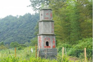 這座完整的“惜字爐”位于易家田村巫水河西岸田垅邊,座北朝南,塔下河水潺潺,古木參天,景色宜人。全爐六角六面形,三層式格局,分為底層、亭座、亭身、云蓋、亭頂五部分。其中基礎(chǔ)層高105cm,主體第一層至第三層高度分別為120cm、105cm、88cm,頂層高70cm,連同3個云蓋在內(nèi)總高度達6米。“惜字爐”呈六面形,基礎(chǔ)層為正方形,四面各寬140cm;主體第一層至第三層每面寬度分別為70cm、60cm、50cm。頂層為3個寶葫蘆。