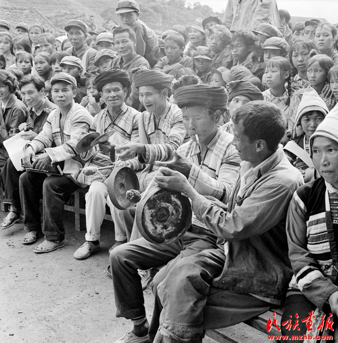1979年,我國認定基諾族為中國第56個民族,圖為基諾族群眾敲鑼打鼓歡慶的場景(中國民族圖片庫資料)