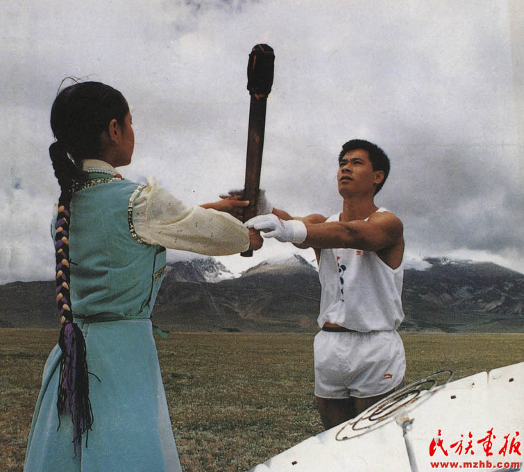 1990年,象征著亞洲30億人民“團結(jié)、友誼、進步”的第十一屆亞洲運動會在中華人民共和國首都北京隆重開幕。8月7日,在西藏的念青唐古拉峰下,藏族少女達娃央宗點燃火把,傳遞給前世界冠軍、“體操王子”李寧(壯族),李寧接過圣火,點燃了火種盒內(nèi)的火種《民族畫報》1990年第11期