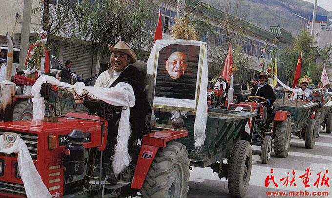 2004年8月21日,西藏山南地區(qū)乃東縣的農(nóng)牧民高懸鄧小平畫像,開著拖拉機在山南街頭巡游,表達對改革開放總設(shè)計師鄧小平同志的深切緬懷。改革開放后,西藏自治區(qū)農(nóng)牧民的年人均收入已從改革開放初期的幾百元上升至2004年的2000元左右,西藏城鎮(zhèn)居民年收入則超過7000元,位居西部前列?!睹褡瀹媹蟆?008年第12期