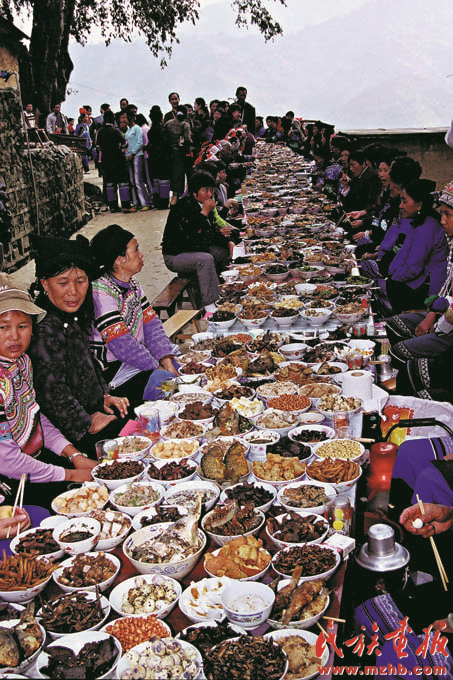 經(jīng)過近30年的改革開放,各族人民的生活發(fā)生了翻天覆地的變化。圖為2005年哈尼族在年節(jié)時擺的長街宴,席間有許多民族特色佳肴。最長的云南紅河州綠春縣的長街宴在2004年被載入世界吉尼斯紀錄《民族畫報》2005年第2期