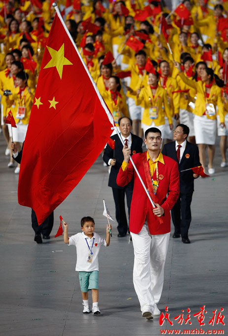 2008年8月8日,全國各族人民期盼已久的第二十九屆奧林匹克運動會在北京隆重開幕,圖為北京奧運會中國代表團入場儀式上,運動員姚明領(lǐng)著汶川大地震中最小的救人英雄林浩入場?!睹褡瀹媹蟆?008年第9期