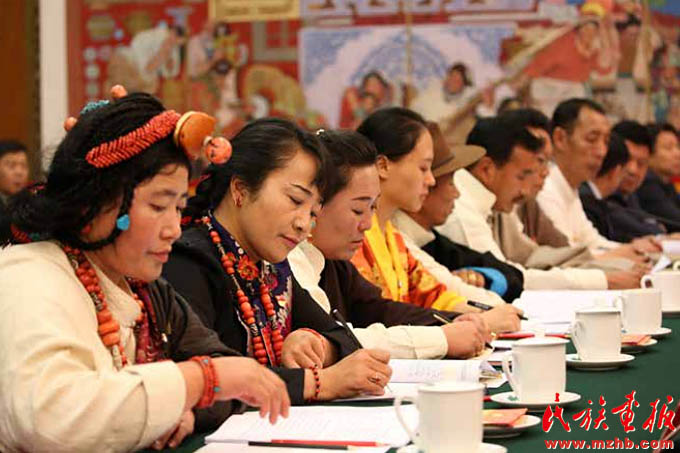 2017年10月18日,在中國共產(chǎn)黨第十九次全國代表大會上,習近平鄭重宣示:“經(jīng)過長期努力,中國特色社會主義進入了新時代,這是我國發(fā)展新的歷史方位?!笔糯髨蟾嬷?,習近平用五句話深刻揭示了新時代的內(nèi)涵,指出這個新時代,是承前啟后、繼往開來、在新的歷史條件下繼續(xù)奪取中國特色社會主義偉大勝利的時代,是決勝全面建成小康社會、進而全面建設(shè)社會主義現(xiàn)代化強國的時代,是全國各族人民團結(jié)奮斗、不斷創(chuàng)造美好生活、逐步實現(xiàn)全體人民共同富裕的時代,是全體中華兒女勠力同心、奮力實現(xiàn)中華民族偉大復興中國夢的時代,是我國日益走近世界舞臺中央、不斷為人類作出更大貢獻的時代。圖為席黨的十九大的西藏自治區(qū)代表團代表在討論十九大報告?!睹褡瀹媹蟆?017年第11期