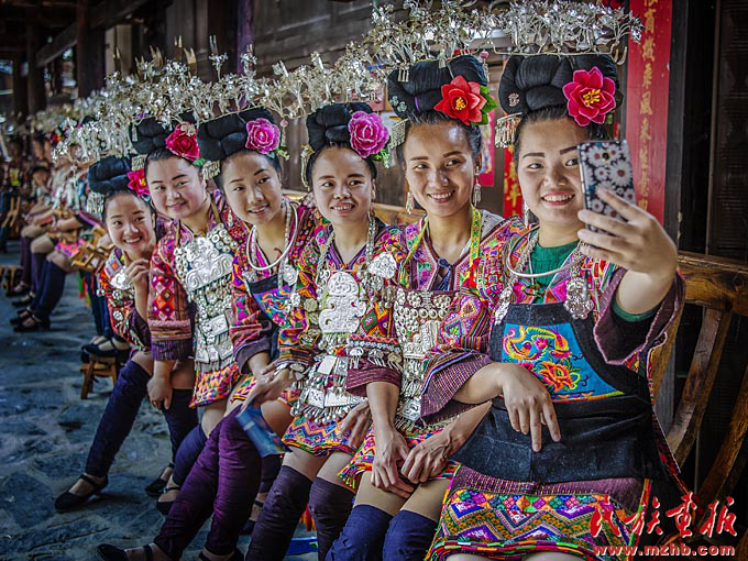 經(jīng)歷改革開放40年的發(fā)展,我國社會生產(chǎn)力、綜合國力、人民生活水平實現(xiàn)了歷史性跨越,全黨全國各族人民要更加緊密地團結(jié)在以習近平同志為核心的黨中央周圍,高舉中國特色社會主義偉大旗幟,不忘初心,牢記使命,將改革開放進行到底,不斷實現(xiàn)人民對美好生活的向往,在新時代創(chuàng)造中華民族新的更大奇跡。圖為貴州民眾盛裝自拍。《民族畫報》2018年第3期