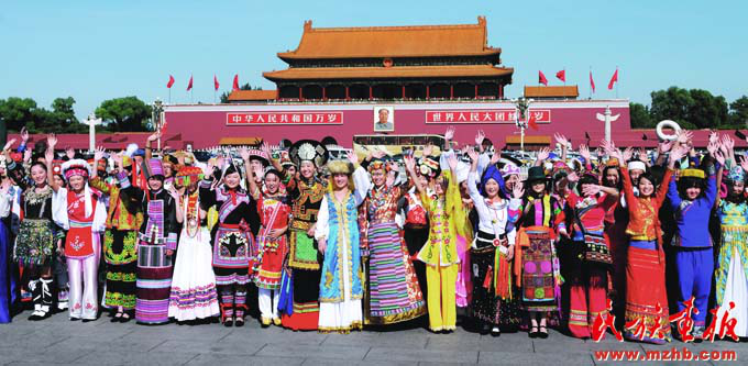 新中國成立以來,黨和國家始終堅持把馬克思主義民族理論同中國民族問題具體實際相結(jié)合,始終堅持把民族工作作為一項重大工作來抓,團結(jié)帶領(lǐng)全國各族人民共同團結(jié)奮斗,共同繁榮發(fā)展,開創(chuàng)了中國特色解決民族問題的正確道路,取得了舉世矚目的成就,積累了彌足珍貴的成功經(jīng)驗。2009年10月1日,在北京天安門廣場,20萬軍民以盛大的閱兵儀式和群眾游行歡慶新中國60華誕,圖為各民族學生參加“團結(jié)奮進”方陣群眾游行?!睹褡瀹媹蟆?009年第10期