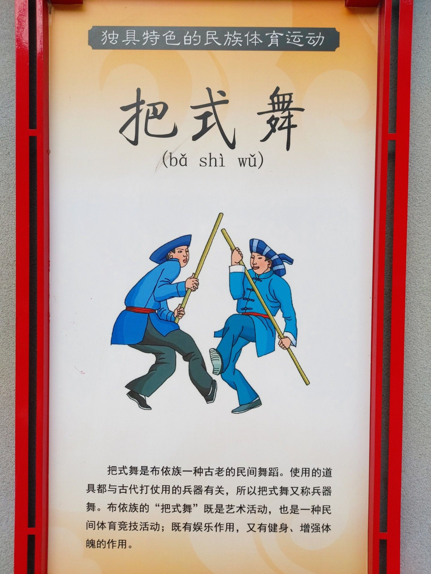 把式舞是布依族一種古老的民間舞蹈。使用的道具都與古代打仗用的兵器有關(guān),所以把式舞又稱兵器舞。布依族的“把式舞”既是藝術(shù)活動,也是一種民間體育競技活動;既有娛樂作用,又有健身、增強體魄的作用。