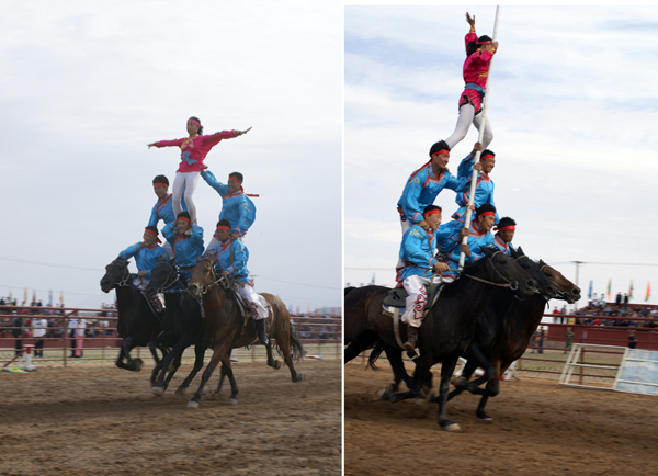 蒙古族的馬術(shù)表演非常精彩,有很多項(xiàng)目。“跨越障礙”是在運(yùn)動(dòng)場(chǎng)跑道上每隔幾十米設(shè)置一個(gè)高1米的跨欄。跑道終端立著一個(gè)直徑約2米的火圈,矯健的坐騎從起跑線(xiàn)踏蹄起跑,越過(guò)跨欄,鉆過(guò)火圈直達(dá)終點(diǎn)。“乘馬斬劈”是在200-250米的距離之間樹(shù)起十幾個(gè)目標(biāo)。騎手們手持馬刀,疾馳如飛,經(jīng)過(guò)一個(gè)個(gè)目標(biāo)時(shí)舉刀劈砍,刀起標(biāo)落?!榜R上技巧”是由運(yùn)動(dòng)員們?cè)陲w馳的馬背上做出各種造型動(dòng)作。運(yùn)動(dòng)員一般八九歲就要在馬術(shù)隊(duì)接受?chē)?yán)格的訓(xùn)練。技巧表演可分單項(xiàng)和多項(xiàng),其中又包括單人單馬、單人雙馬、雙人雙馬和多人多馬。一匹飛奔的馬經(jīng)過(guò)騎手身邊,騎手可以突然抓住馬鬃翻身上馬,又會(huì)突然下馬腳尖點(diǎn)地再躍上馬背。其他技巧還有在馬背上“空翻倒立”“側(cè)方隱蔽”“樓里藏身”以及驚險(xiǎn)的“馬上疊羅漢”等表演【如圖,劉軍攝影,編者修剪合成兩圖】。