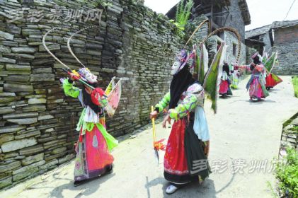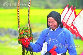 安順地戲的顯著特點是演出者頭蒙青巾,腰圍戰(zhàn)裙,戴假面于額前,手執(zhí)戈矛刀戟之屬,隨口而唱,應聲而舞。