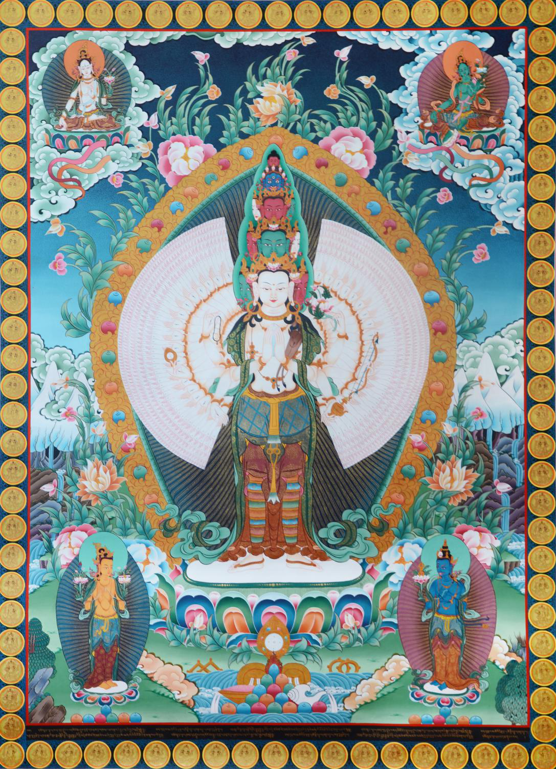 這個(gè)唐卡上面左上角是綠度母,右上角是白度母.左下角是金剛手菩薩,右上角是文殊菩薩。