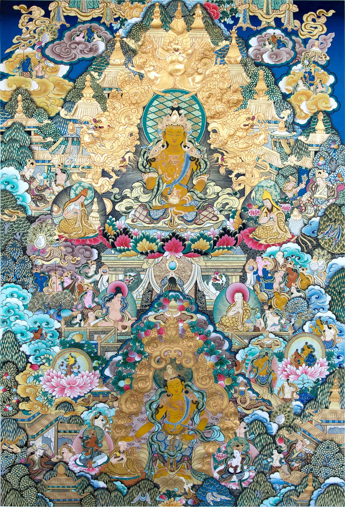 主尊未來世界彌勒佛菩薩,左邊描繪了噶當派創(chuàng)世者阿底峽尊者與他的弟子。右邊描繪了格魯派的創(chuàng)世者宗喀巴大師與兩大弟子克主杰和迦側(cè)杰,中部周圍供奉者八大隨喜菩薩文殊菩薩、普賢菩薩、觀世音菩薩、金剛手菩薩、虛空藏菩薩、地藏菩薩、彌勒菩薩、除蓋障菩薩,畫面四角供奉為彌勒佛未來世界的迎接與弘揚佛法的情景。畫面上空描繪了仙女四處飛揚,空中漂浮著吉祥的圖案與神秘的瑞相等等。整體畫完之后選擇一個殊勝吉祥的日子點所有諸佛的五官,發(fā)髻、手勢、法器、畫面后部畫家要親自寫聲、語、法的字號。作品完工之后寺院里進行眾多活佛和高僧大德的加持與開光儀式。