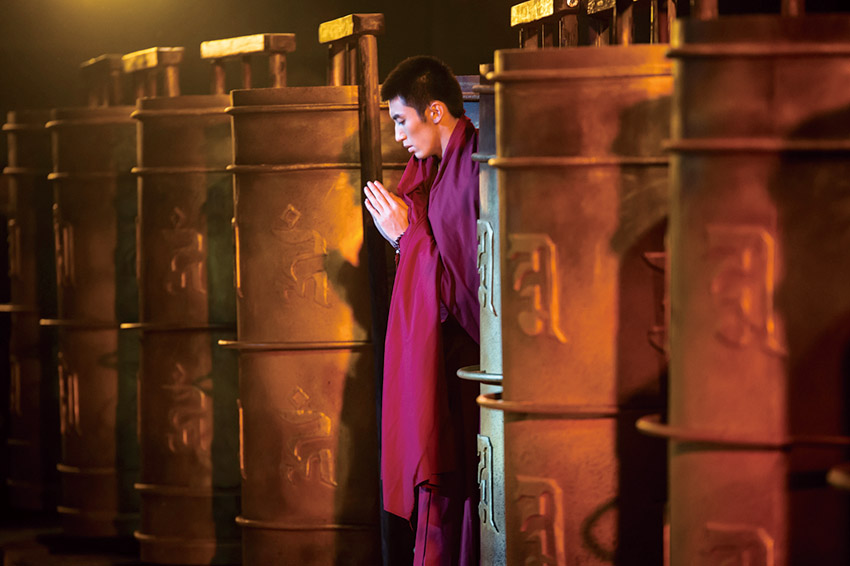 扮演倉(cāng)央嘉措的是就讀于解放軍藝術(shù)學(xué)院的學(xué)生黃琛迪。丁偉說(shuō):“我跟很多知名演員都有過(guò)接觸,但是每個(gè)人都很忙,有好多錢(qián)要賺,沒(méi)有一個(gè)靜下心來(lái)的狀態(tài)。而這個(gè)演員的眼睛很干凈,還沒(méi)有被名利、榮譽(yù)侵?jǐn)_。我們把他帶到藏區(qū)去采風(fēng),臨走時(shí)他提出想到寺廟里住一段時(shí)間。我們到了甘肅夏河倉(cāng)門(mén)寺,他在那里和僧人們一起生活,每天看他們誦經(jīng)。他逐漸進(jìn)入狀態(tài),慢慢體會(huì)到了倉(cāng)央嘉措的精神世界?!?/p>