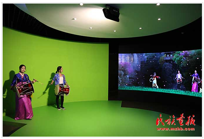 在長鼓舞體驗區(qū),參觀者紛紛走到長鼓前,隨著熒屏上顯示的節(jié)奏與動作提示,體驗長鼓舞的高雅飄逸,另一側大屏幕上,顯示出相應的歌曲與舞蹈