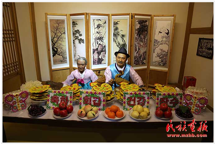 朝鮮族人民非常注重禮節(jié),尤其崇尚尊老愛幼的傳統(tǒng)美德。步入廳堂,回婚禮(為紀念結婚60周年而舉行的賀禮)中,新郎新娘的蠟像引得大家駐足觀看,新郎的衣著形似明朝時期的官服,頭戴官帽,據(jù)說“新郎官”的稱謂就由此而來。隆重的回婚禮教育人們忠于愛情,也是儒家思想中“修身齊家治國平天下”中的“齊家”思想的延續(xù)。走進另一廳堂,朝鮮族的花甲禮,六十為一甲子,花甲之意來源于此。花甲禮是朝鮮族家庭為60歲老人舉行的大型生日宴。在擺滿各種花色的食品的“大席”前,兩位老人面南端坐,接受兒孫、親朋好友的跪拜與祝福。