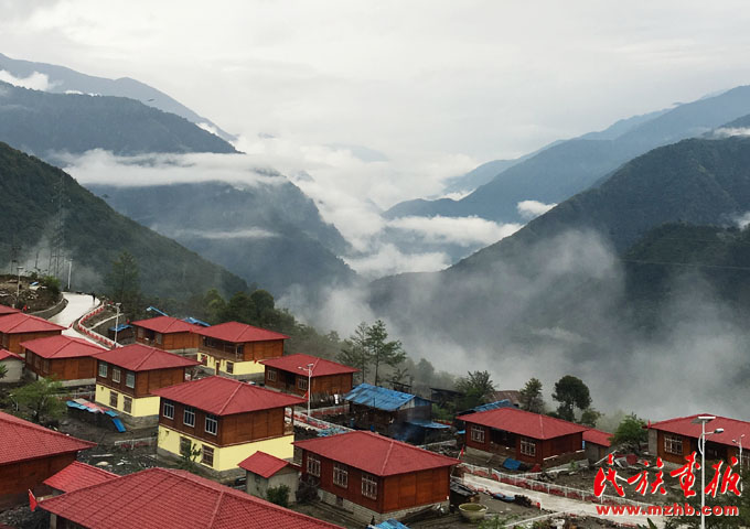 在高山之巔新建起來的達木珞巴民族鄉(xiāng)的安居房,是茫茫云海中最鮮艷的一抹紅(央金 攝影)