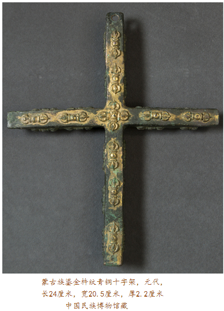 眼前此件在內蒙古達茂旗出土的元代鎏金青銅十字架,四面排列有浮雕金剛杵紋,其正面每個金剛杵圖案上均有鎏金裝飾,十字架上部穿孔則可用于懸掛。金剛杵是藏傳佛教里的修行法器,象征力量與智慧;而十字架則是基督教文化的標志,如此混搭,歷史便要傳遞出種種:在信仰藏傳佛教的蒙古高原,金剛杵,象征無畏圓滿,十字架,則代表救贖重生,東西方文化的結合亦呈現(xiàn)某種文明可能達到的無可比擬之高度。