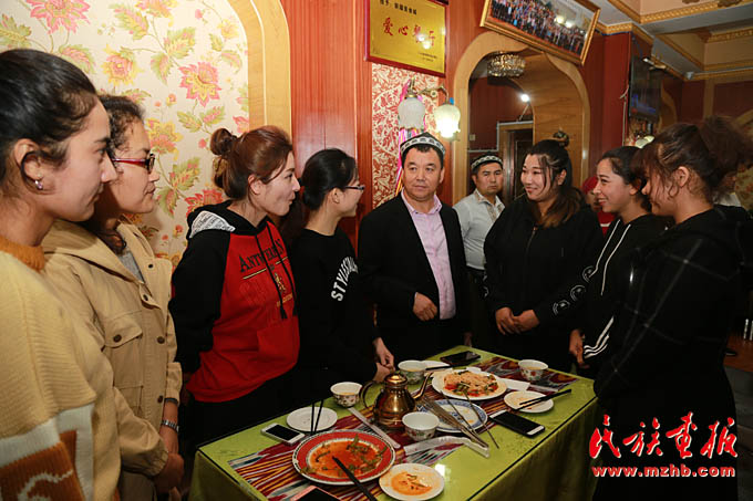 阿地力·買(mǎi)買(mǎi)提與維吾爾、哈薩克、回族等員工商量為學(xué)生們和殘疾人就餐優(yōu)惠的事情