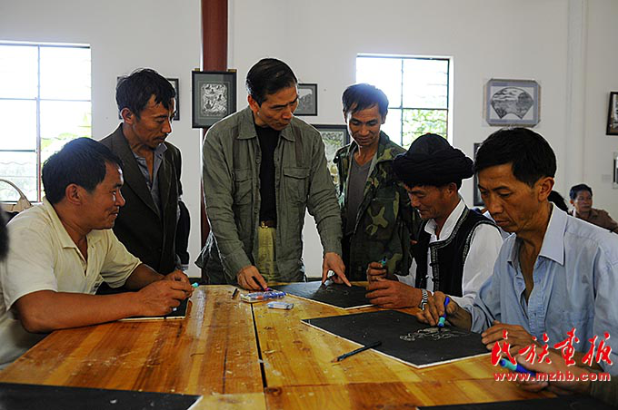 為了創(chuàng)作更好的作品,阿峨新寨村的版畫藝術家們經(jīng)常聚在一起討論切磋