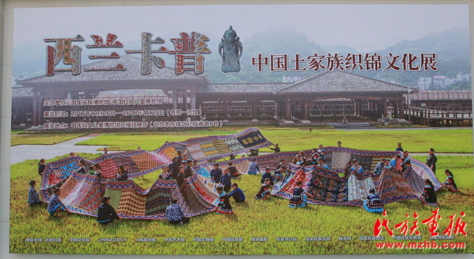 2017年12月20日,“西蘭卡普——中國(guó)土家族織錦文化展”在北京中國(guó)婦女兒童博物館開(kāi)展。展覽由中國(guó)民族博物館和中國(guó)婦女兒童博物館聯(lián)袂主辦,張家界市人民政府駐京辦事處協(xié)辦。展覽開(kāi)幕前舉行了土家織錦文化小型座談會(huì),與會(huì)嘉賓從不同角度暢談了土家織錦的藝術(shù)特色。中紀(jì)委駐財(cái)政部紀(jì)檢組原組長(zhǎng)、全國(guó)婦女手工編織協(xié)會(huì)副會(huì)長(zhǎng)賀邦靖,國(guó)家新聞出版廣電總局原黨組成員、副局長(zhǎng)宋昌明,中國(guó)作家協(xié)會(huì)主席團(tuán)委員、中國(guó)少數(shù)民族作家學(xué)會(huì)常務(wù)副會(huì)長(zhǎng)葉梅,張家界市委常委、宣傳部長(zhǎng)郭天保,張家界市副市長(zhǎng)尚生龍,國(guó)家民委國(guó)際交流司原副司長(zhǎng)吳金光,中國(guó)婦女兒童博物館副館長(zhǎng)劉華彬、北京孔廟和國(guó)子監(jiān)博物館館長(zhǎng)吳志友等人參加了座談會(huì)并參觀展覽。
