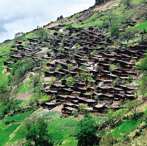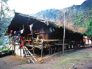 在怒江上游峽谷聚居的傈僳村寨都建在高山的半山上,其民居俗稱為“千腳落地房”。說“千腳落地”雖有些夸張,但也足以形象地說明峽谷溫熱的氣候和山高坡陡的地理條件。在雨季時,“千腳”阻力最小,使山洪順利傾瀉而下,又很快干爽,免受潮氣。而且不需挖地動土,不必移石砌墻,對木料沒有過高要求,長短皆用,在生態(tài)脆弱的高山峽谷也算環(huán)保建筑?!扒_落地”是因建房時先在確定的屋基上依斜坡程度和住房面積打進數(shù)十根到百余根木樁為基樁,以保證居室樓板的平正?;鶚洞蚝煤?,除四面留幾根高柱作為整個房屋的立柱外,在密集木樁所形成的平面上滿鋪竹篾編織的樓板,還有竹篾圍墻,所有結構皆用竹篾綁扎。屋頂鋪苫草或蓋木片瓦,近幾年,已陸續(xù)換上了大塊的水泥波形瓦。房門開在山墻一側,有廊道,可做曬臺,平時穿的衣服都搭在這兒,也是婦女做針線活的地方。隨著怒江峽谷的開發(fā)和新農(nóng)村建設的深入,通路的村寨將很快會改變面貌。