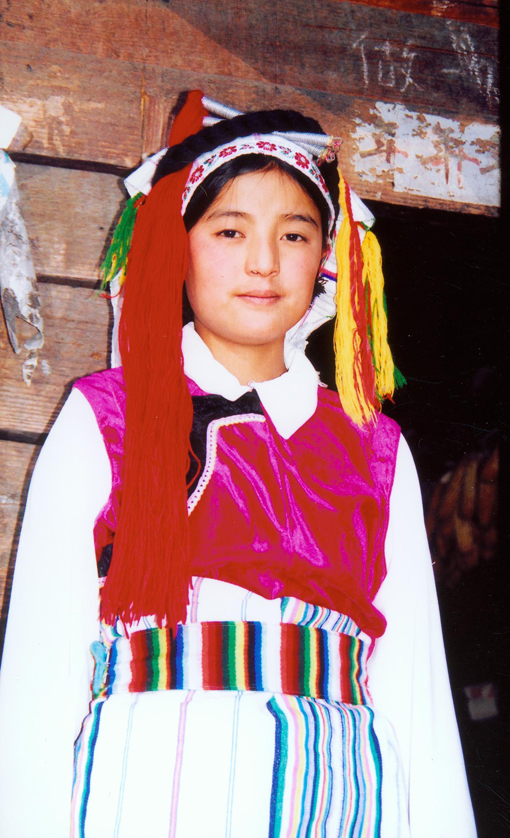 蘭坪型服飾則受當(dāng)?shù)匕鬃搴蜐h商的影響較深?!暗刂髅薄笔降膱A頂小帽、對(duì)襟長(zhǎng)衫和馬褂等裝束,向我們展示了處在礦產(chǎn)資源開發(fā)區(qū)域的民族群屬,其傳統(tǒng)著裝也因頻繁接觸外界文化而受到影響,并有所改變。