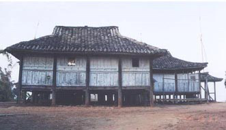 比較典型而普遍的是以德宏地區(qū)一戶一院式的正方形冠蓋式竹樓。構(gòu)架為穿斗式木梁柱,樓面、隔間均用竹片或木板鋪設(shè)。這種竹樓分主樓和附房?jī)刹糠?。上下兩層,有主副兩座樓梯。主樓呈正方形,樓上住人,分為臥室和客廳,供全家人起居、會(huì)客和存放糧食、雜物之用;樓下圈養(yǎng)牲畜。附房多建在主樓的一側(cè),用作堆放柴草及安置舂米的腳碓。