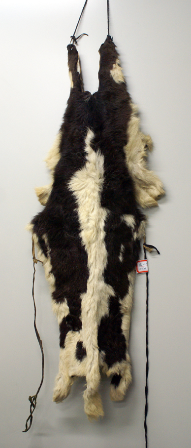 門隅南部地區(qū)的門巴族婦女,不分老少,袍服外披一張較為完整的小牛犢皮或巖羊皮,毛朝內(nèi)、皮板朝外,牛皮頸部朝上,尾部朝下,略做加工、而且四肢皮伸向兩側(cè)。以此為美飾,吉慶節(jié)日或訪親會友,都要披一張新牛皮做盛裝。傳說,唐代文成公主進(jìn)藏時(shí)背上披著皮子以避邪,后來此物賜給門隅婦女,后此物就成為門巴族婦女歷來沿用的裝束。