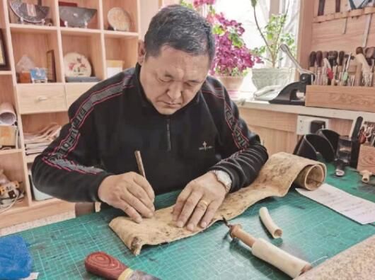 “觸網(wǎng)”是萬(wàn)德順應(yīng)時(shí)代的一次嘗試,也是他手工皮藝之路的又一次轉(zhuǎn)型。12歲時(shí),他從馬背上摔下來,在舅爺家休養(yǎng)時(shí)第一次接觸到皮雕,并與皮雕結(jié)下不解之緣。42歲時(shí),萬(wàn)德在手術(shù)中發(fā)生意外導(dǎo)致癱瘓。經(jīng)歷了迷茫、絕望的他,決定重拾老祖宗留下的手工皮藝,在輪椅上把傳承家族皮雕手藝作為后半生奮斗的事業(yè)。