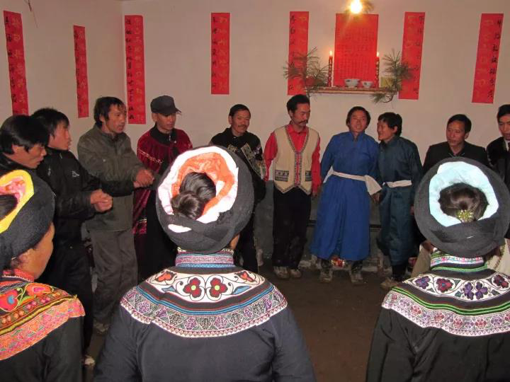 4、源自于搶婚習(xí)俗。以前,在彝區(qū)還有暴力阻攔或嘲弄接親人的習(xí)俗,這種習(xí)俗因搶婚相反,我們姑且稱(chēng)之為攔婚習(xí)俗。何為攔婚?就是女方家就安排出嫁女素日的伙伴在接親隊(duì)來(lái)的路口守候著,當(dāng)接親隊(duì)來(lái)時(shí),抑或用水澆潑接親人,抑或抓粘草籽撒在接親人身上,甚至用蕁麻抽打接人,讓接親人很是吃消不下,既痛苦又尷尬。這種習(xí)俗可能源自于古時(shí)的搶婚制度。古時(shí),經(jīng)濟(jì)文化落后之時(shí),禮儀制度還不健全,存在著搶婚的現(xiàn)象,女子無(wú)法主宰自己的命運(yùn),被當(dāng)作財(cái)產(chǎn)和工具被男人搶奪。隨著禮儀制度的興起,女子的自我意識(shí)和維權(quán)意識(shí)有了增強(qiáng),她們內(nèi)心深處極力反對(duì)婚姻壓迫和搶奪,希望與男子取得平等的待遇。于是就開(kāi)始出現(xiàn)了阻攔和戲弄接親人的習(xí)俗。阻攔和嘲弄接親人的方式多種多樣,也從最早的野蠻方式逐步向文明過(guò)渡。應(yīng)該說(shuō),阿買(mǎi)懇是攔婚習(xí)俗的延伸與發(fā)展,又折射出了搶婚的影子。阿買(mǎi)懇設(shè)置了幾十道盤(pán)歌的關(guān)卡,每道關(guān)卡都需要智慧和才藝,這是一種傳統(tǒng)習(xí)俗繼承中的文明發(fā)展表現(xiàn)?!鞍①I(mǎi)懇”的“懇”,除上面講的有“跳舞”、“歌舞”之意外,還有“搶”、“奪”之意。綜上所述,阿買(mǎi)懇蘊(yùn)含了搶婚制中深層次的文化心理積淀。