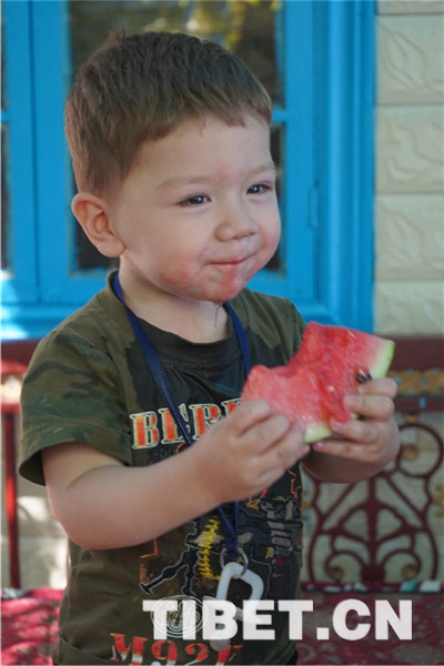 走在喀贊其街頭,可以看到穿著鮮艷花色連衣裙的維吾爾族婦女、扎著漂亮方形頭巾的哈薩克族姑娘、戴著白色圓帽的回族老漢……如同觀看一場民族服裝表演。圖為喀贊其老街上的“悠閑時光”。