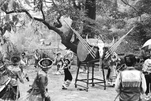 每年農(nóng)歷正月初二至十五花山節(jié),主人與遠(yuǎn)道而來(lái)的客人共同歡慶。他們圍成一圈,喝著燒酒,跳起歡快的苗家舞蹈,唱著動(dòng)聽(tīng)的民歌,一天的勞頓、一年的艱辛,被熱烈的燒酒驅(qū)趕著,被歡愉的歌舞浸潤(rùn)著,被悠揚(yáng)的蘆笙旋律激蕩著。蘆笙、燒酒、蠟染,精美古樸的苗族服飾,木槽里錘打的糍粑……與四周山山水水一同融匯,幻化成一個(gè)民族的標(biāo)識(shí)。