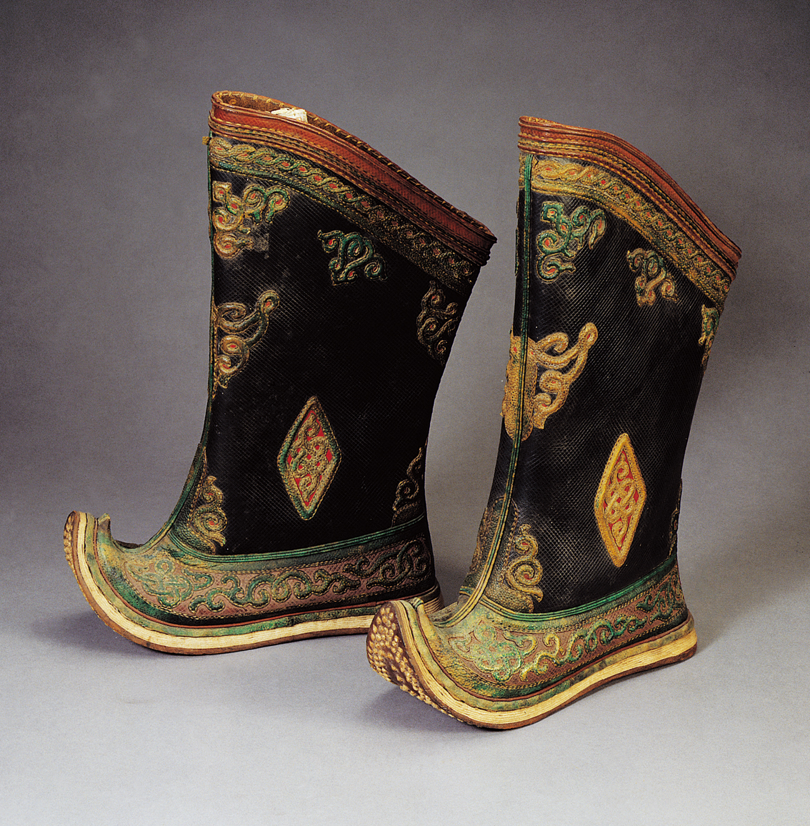 【圖為蒙古族民國時期貼花納底翹尖牛皮男靴,中央民族大學(xué)民族博物館館藏】