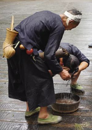 “同樣是掛在后腰的竹簍,貴州岜沙苗族漢子的竹簍則少一分嬌俏,多一分霸氣。在距離貴州黔東南苗族侗族自治州從江縣8公里的山坳上,坐落著“最后一個(gè)持槍部落”——岜沙苗寨。這里保留了古老的風(fēng)貌,男子頭挽發(fā)髻,身著亮布衣褲,佩刀扛槍。在岜沙男子手中,鐮刀除了作為勞動(dòng)工具,“鐮刀剃頭”的習(xí)俗更是令人稱奇。因此,掛在腰上鐮刀簍子也就成為了當(dāng)?shù)啬行缘碾S身配件。這種竹簍呈靴形,簍身的弧度與鐮刀完美契合,如此一來,鐮刀入簍后,既不易掉出、不易劃傷,又輕巧便捷,好不威風(fēng)!”