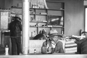 一個(gè)藏族老大爺坐在火爐邊,不言不語,與茶館熱鬧的景象形成鮮明對(duì)比。