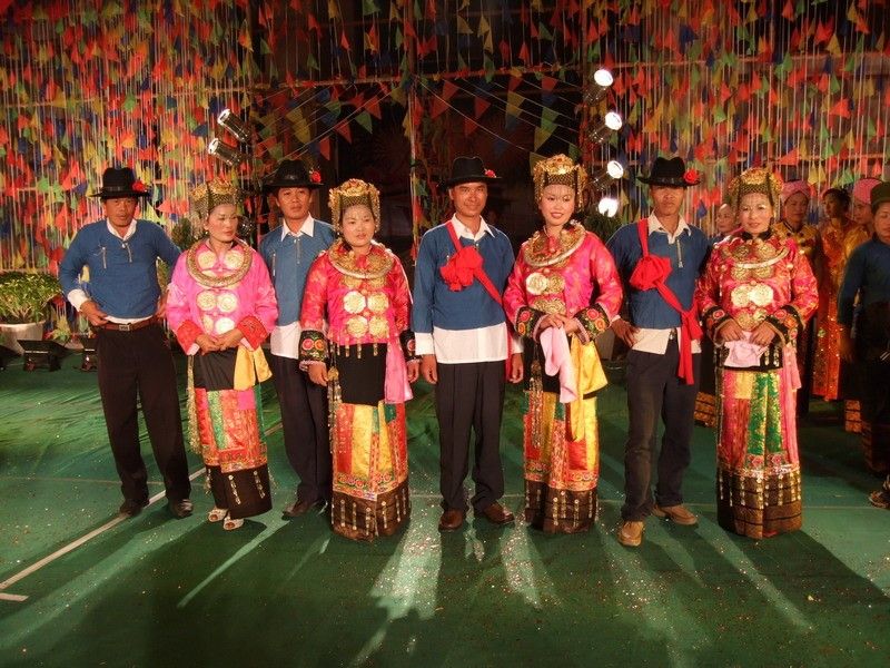 主婚人念完祝詞以后,新郎、新娘各在桌上揪下一團(tuán)糯米飯,蘸點(diǎn)米酒、食鹽、舂鹽捧、芭蕉后擺在桌前。主婚人拿起一條長(zhǎng)長(zhǎng)的白線,從左至右纏在新娘、新郎的肩背,將白線兩端搭在“茂歡”之上,表示將一對(duì)新人的心拴在一起。然后再拿兩縷白線,分別纏在新郎、新娘的手腕上,祝愿新婚夫婦百年好合,無(wú)災(zāi)無(wú)難。在座的長(zhǎng)者也各拿兩縷白線,分別拴在新郎、新娘手上,邊拴線,邊念些祝愿詞。拴完線后,婚儀基本結(jié)束,婚宴開(kāi)始,新郎新娘向賓客敬酒致意。