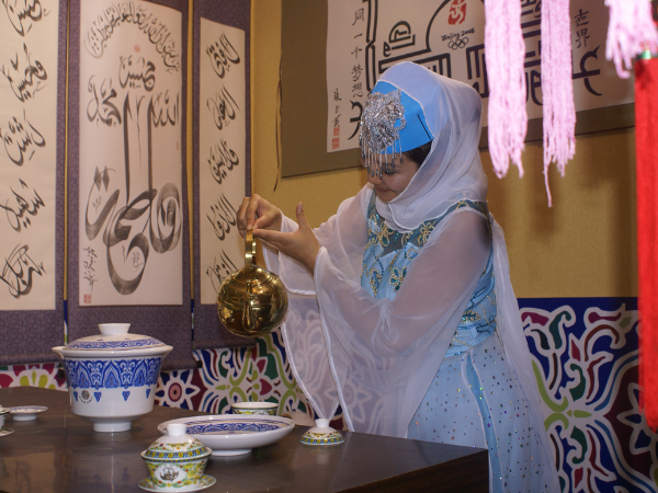 回族普遍喜歡飲茶?;刈逑让裣彩程鹌?,在中國茶文化影響下,形成了以甜味為特色的飲茶習(xí)慣。飲茶之風(fēng)興起于中國晉代,盛于唐代以后,隨之出現(xiàn)了茶具,其中以包括茶托、茶碗、碗蓋的“三坯胎”蓋碗美觀實用?;刈謇^承發(fā)展了這種茶文化,形成了以“三炮臺”為茶具的“八寶蓋碗茶”:在茶具中放入茶葉(茉莉花茶、陜青茶、紅磚茶、窩窩茶、毛尖等)、糖(白糖、紅糖、冰糖、梨膏糖等)及紅棗、核桃仁、桂圓肉、芝麻、葡萄干、枸杞(或柿餅、山楂、姜片、果干)等配料,用開水沖制后飲用。茶葉及配料在不同的地區(qū)、不同的季節(jié),根據(jù)飲茶者的身體狀況與喜好有不同的搭配,如“紅糖磚茶”“冰糖陜青茶”“三香茶”(茶葉、糖、桂圓)、“白四品”(陜青茶、白糖、柿餅、紅棗)、“紅四品”(磚茶、紅糖、紅棗、果干)、“五味茶”(綠茶、山楂、芝麻、姜片)等。八寶茶具有生津解渴、開胃健脾的作用,放入不同的茶料,又具備了不同的健身康體功能。