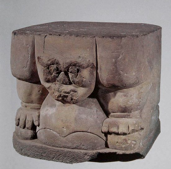 圓雕,白砂石質,近似正方體。圓雕男性人像,面部渾圓,顴骨高突,粗眉上翹,雙目圓睜且外突,鼻梁短粗,獠牙外露,下頜置于胸前,裸體,腹有肚兜,肩于頭齊,肘部后屈,雙手扶膝,下肢屈跪,背部平直。座頂左上角陰刻西夏文三行,計15個字。第一行4字漢譯為“小蟲曠負”;第二行4字漢譯為“志文支座”;第三行7字漢譯為“瞻行通雕寫流行”。背部陰刻漢文一行6字“砌壘匠高世昌”,為西夏石雕工匠的姓名,彌足珍貴。雕像以夸張的手法表現(xiàn)了負重者的神態(tài),反映出西夏時期石雕藝術的獨特風格。迄今在西夏陵區(qū)多座帝陵的碑亭遺址中,已出土這類支座14件,但刻有西夏文字的僅此一件。