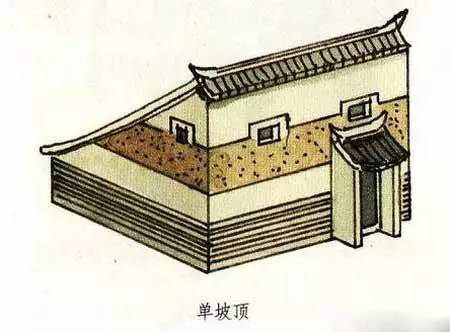 單坡頂就是只有一面坡的屋頂。它與我們常見(jiàn)的兩面坡屋頂有較大的不同,但從一面來(lái)看又有極大的相似性。我們甚至可以說(shuō),單坡屋頂就像是兩面坡屋頂被從中間一切兩半了。單片屋頂一般都用在不太重要的建筑或是附屬性的建筑上。在已發(fā)掘的商代宮殿遺址中,可以看到在商代即有單坡頂?shù)睦茸恿恕6F(xiàn)在的陜西、陜西等地的農(nóng)村,許多民居仍然使用單坡式的屋頂,成為現(xiàn)今較富有特色的一種民居形式。