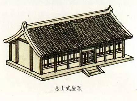 懸山式屋頂與硬山式屋頂一樣有一條正脊和四條垂脊。不過(guò),它又有不同于硬山式屋頂那樣與山墻平齊,而是伸出山墻之外。這部分伸出山墻之外的屋頂是由下面伸出的桁(檁)承托的。所以懸山式屋頂不僅有前后出檐,在兩側(cè)山墻上也有出檐。懸山式是兩面坡屋頂?shù)脑缙谧龇ǎ贿^(guò)中國(guó)古代的重要建筑基本沒(méi)有使用懸山式屋頂?shù)?,特別是唐代以前尤為少見(jiàn)。