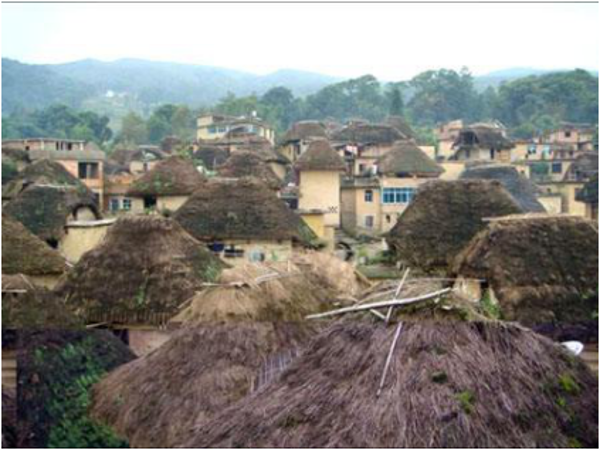 哈尼族一個核心的家庭的一幢完整的磨菇房,包括正房、左右?guī)?、庭院和圍墻等?shù)個建筑單元,家中配有腳碓、石磨、水缸、織機、藍靛染缸、犁、耙、刀、斧、鋤、籮和火塘等生產生活設施,滿足作為社會生產和生活單位的家庭的諸多需求。若干家庭的磨菇房逐次排列,就逐漸變成了一個哈尼族山寨的磨菇房群落。
