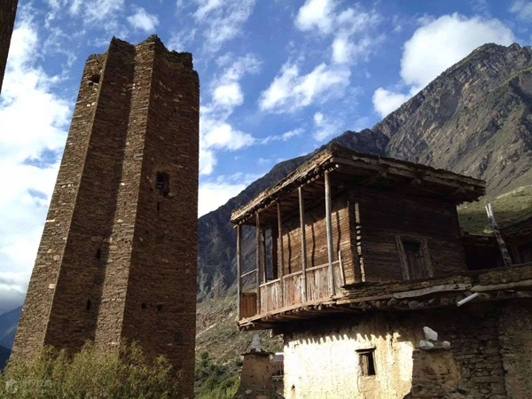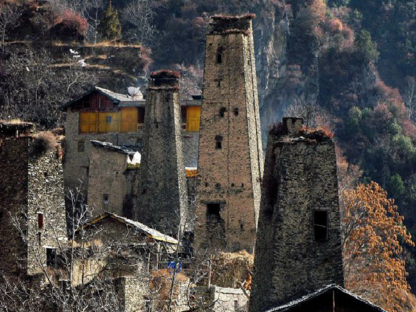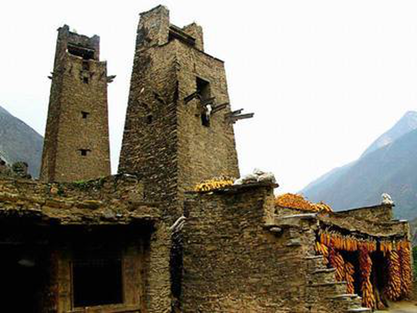 在羌語中,碉樓被稱為“邛籠”,意為美麗、高貴的房子,早在2000年前《后漢書·西南夷傳》就有羌族人“依山居止,壘石為屋,高者至十余丈”的記載。碉樓的高度在十米至三十米之間,用于御敵、貯存糧食和柴草。碉樓有四角、六角、八角幾形式,有的高達十三四層。建筑材料是石片和黃泥土,墻基深1.35米,以石片砌成。石墻內(nèi)側(cè)與地面垂直,外側(cè)由下而上向內(nèi)稍傾斜。修建時不繪圖、吊線、柱架支撐,全憑高超的技藝與經(jīng)驗。建筑穩(wěn)固牢靠,經(jīng)久不衰。自唐朝來,羌族人民因各種原因向西北遷移,到了西藏和青海,所以現(xiàn)在,羌族碉樓也往往被稱為藏族碉樓。