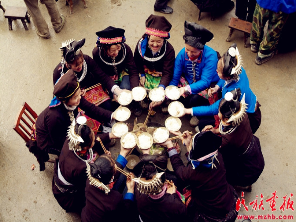 “和氣飯”后新郎家大擺酒席招待來賓,主客共飲,敬酒對歌。歡笑聲中,幸福的喜悅洋溢在新郎和新娘的臉上。