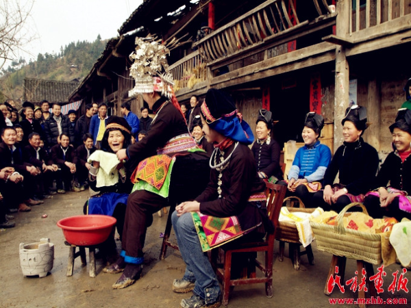 敬酒過后,新娘走上吊腳樓進(jìn)入洞房休息片刻,然后與新郎一同在樓上向前來賀喜的親友拋灑喜糖。來賓蜂擁而上爭搶喜糖,一片歡騰場面。分完喜糖,新娘來到吊腳樓前的院子里用早已準(zhǔn)備好的清水親手為婆婆擦臉,表示新媳婦對長輩的尊敬與孝心。