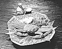 撒嘎當,即螃蟹剁生。以新鮮螃蟹為主要原料,配以糊辣椒粉、姜末、蒜泥、芫荽、南瓜籽、炒米面等佐料調制。加工時,將螃蟹敲死放在火塘中翻燒至熟,去掉硬殼后剁細成泥狀,加適量食鹽、糊辣椒末、蒜泥、熟南瓜子面、炒米面調拌均勻即成。這道菜味香、辣、鮮,用糯米飯蘸吃,或用蘿卜、白菜、水薄荷、野芹菜等蘸吃均可。