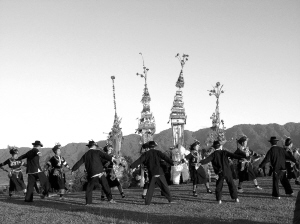 登窩羅時,領唱的人在前,這人叫“稍干”。其他人雙手叉腰,跟著稍干唱。邊唱邊大蹲大跳,一會兒背對背,一會兒面對面。春節(jié)圍著窩羅牌坊跳,平時圍著一張擺滿煙酒茶果的桌子跳,意思是圍著太陽、月亮轉。