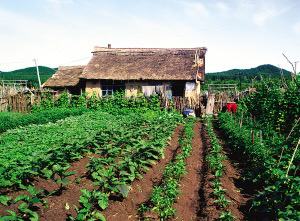 赫哲族人多用鍬把粗的柞木夾成障子,形成院落。房屋前面留塊院子,養(yǎng)雞、豬,放醬缸、農(nóng)具,碼著成排的木柈子垛;房后的菜園子較大,種些架豆角、黃瓜、茄子、小蔥、辣椒、西紅柿等蔬菜。黑龍江同江市街津口村的街道東西走向,道南的房子從后面開(kāi)門(mén)繞過(guò)山墻進(jìn)院,菜園子在前院;道北的房子從前門(mén)穿過(guò)菜園子邊的巷道到前院再進(jìn)屋。
